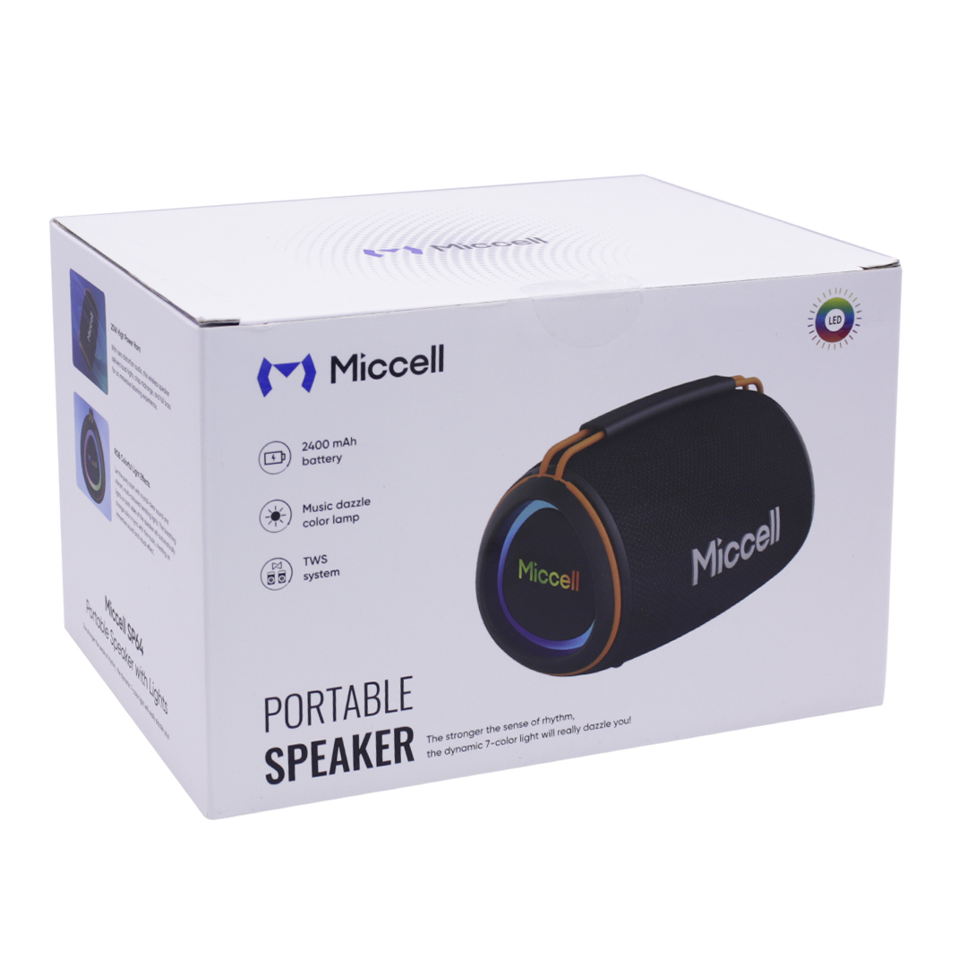 El Miccell VQ-SP64 es una altavoz Bluetooth portátil , diseñada con una estética moderna para uso tanto en interiores como en exteriores. Cuenta con una potencia de salida de 15 W a 20 W, conectividad Bluetooth, batería recargable y un asa integrada para facilitar su transporte.