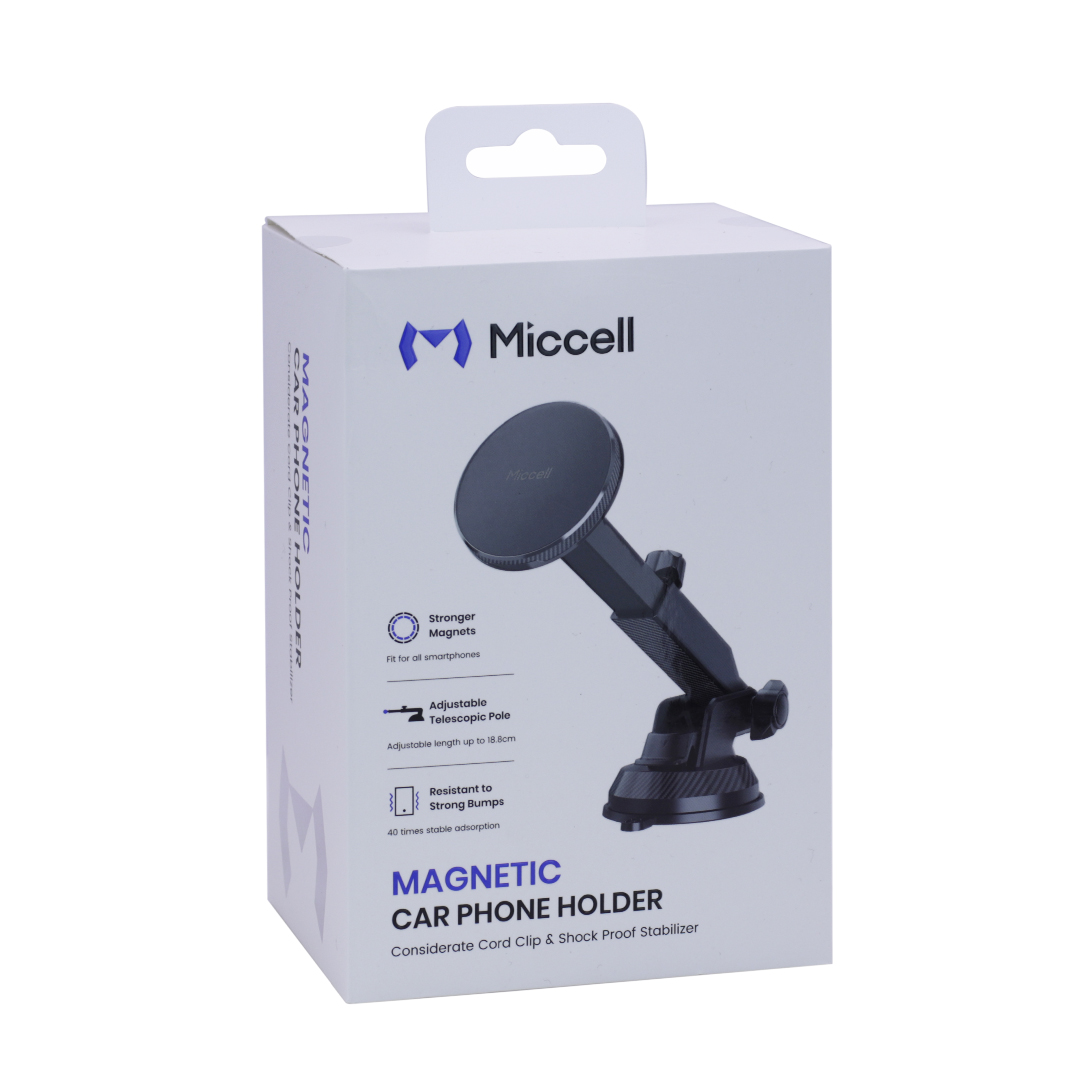 El soporte Miccell VQ-CH21 es un soporte magnético para teléfono de auto con rotación de 360°, fabricado en ABS, PC y silicona. Cuenta con diseño de varilla telescópica y ventosa para fijación en el tablero o parabrisas, siendo una opción versátil y segura para el uso de celular al conducir.